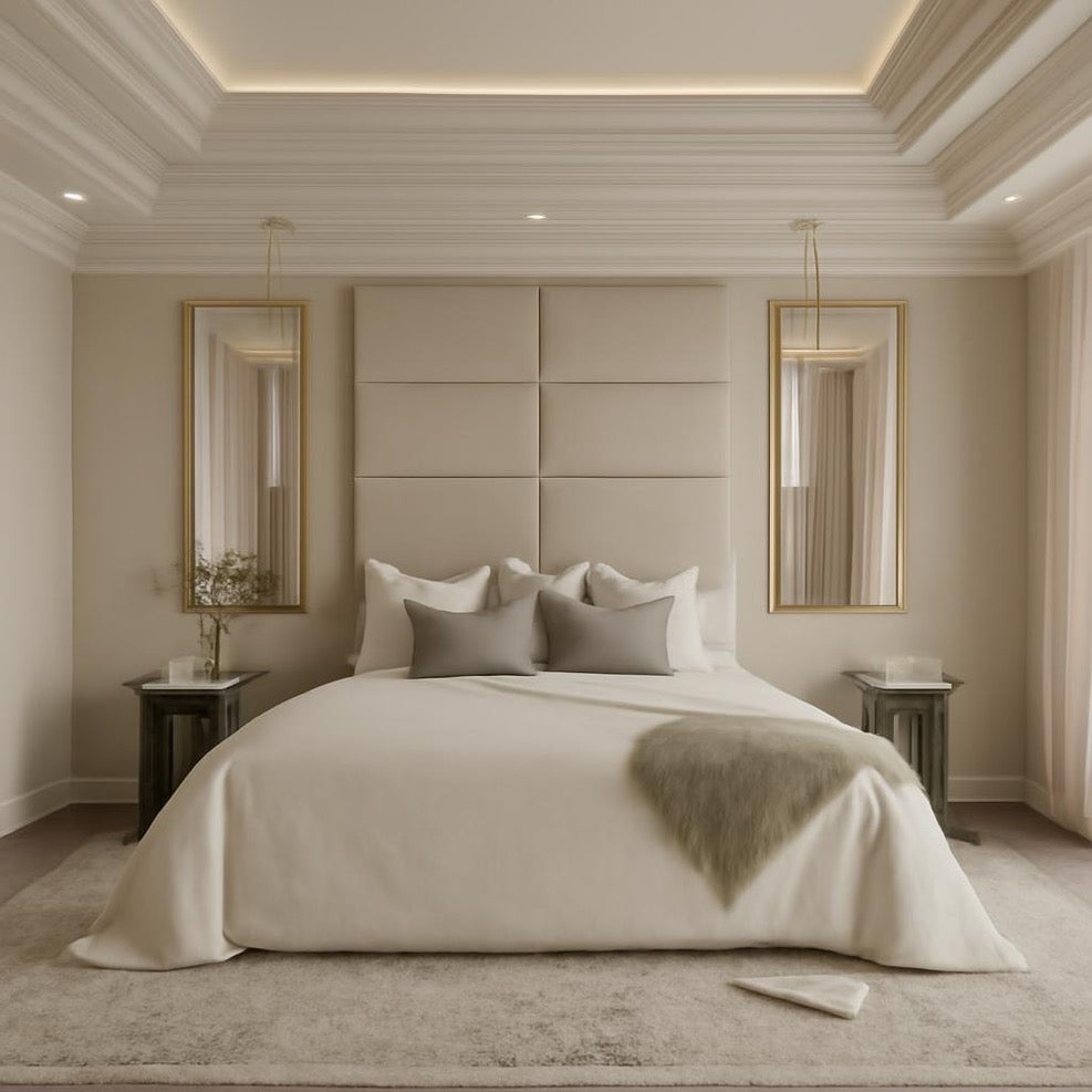 Each cushioned panel is wrapped in premium upholstery fabric of your choosing, offering a tailored look to suit any décor—from minimalist neutrals to bold, rich tones. The deeply padded headboard not only adds plush comfort but also enhances the bed’s modern silhouette, making it ideal for those who value both style and function.